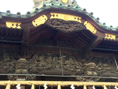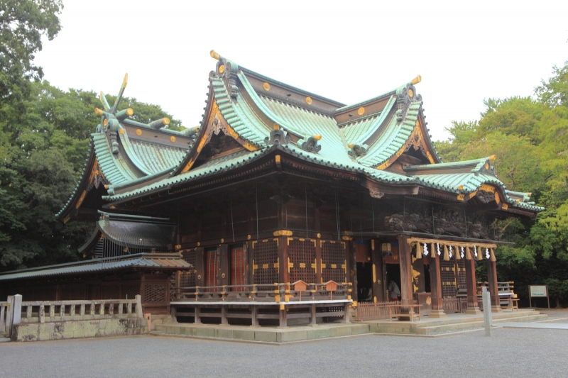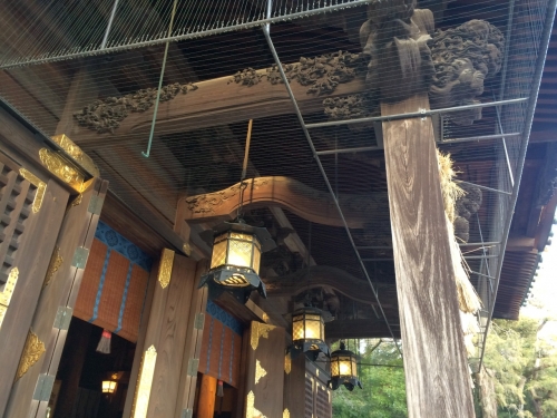 ケヤキの素木で作られた味わいのある建物に、施された細工や彫刻も見事です。拝殿には、天岩戸の物語や、源頼政の鵺(ぬえ)退治など、有名な逸話の図が彫られています。お参りしたら、ぜひ建物もじっくり眺めてみてください。