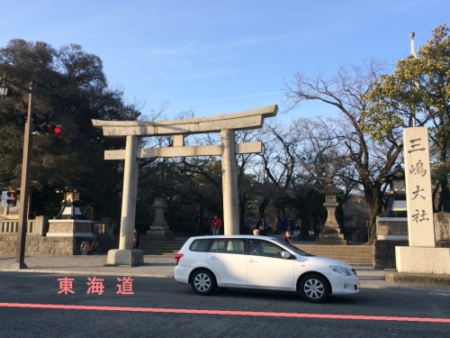 大鳥居をくぐると、すぐに見つけられる大きな石。これはたたり石といい、神社の前を通っていた東海道の交通整理をするために置かれていたそうです。交通整理の石が必要だったなんて、三嶋大社の前の道はどんな様子だったのでしょう?たたり石の話から少し外れますが、三嶋大社の立地を見てみます。