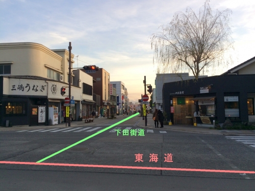 向かって左の写真は門前から見た大鳥居、右の写真は反対に大鳥居から門前を見ています。このように、三嶋大社は東海道に沿って建てられていました。さらに、大鳥居を起点として南方向へ、韮山を通り下田へ続く下田街道がありました。三嶋大社の大鳥居でT字路になる形です。