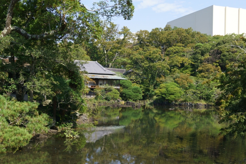かつて小松宮彰仁親王の別邸として造営され、今は国の天然記念物及び名勝に指定されている有料の市立公園・楽寿園。東海道新幹線の停車駅でもある三島駅のすぐ近くに位置しながら、「伊豆半島ジオパーク」のジオサイトとしても認定されており、駅前とは思えないような自然豊かな森を今も残しています。