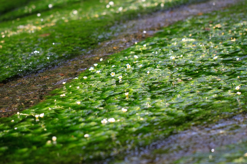 源兵衛川やその支流でも見ることができますが、「三島梅花藻の里」では三島梅花藻を育てているため、ほかのエリアにはないほどの群生している様子が楽しめます。