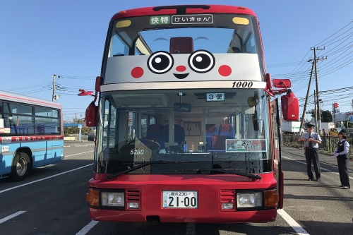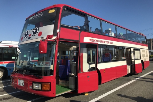 三浦半島を巡る2階建てのオープントップバスは、京急で人気の車両「2100形」をイメージしたもので、フロントの2階部分には京急のマスコットキャラクター「けいきゅん」がデザインされています。