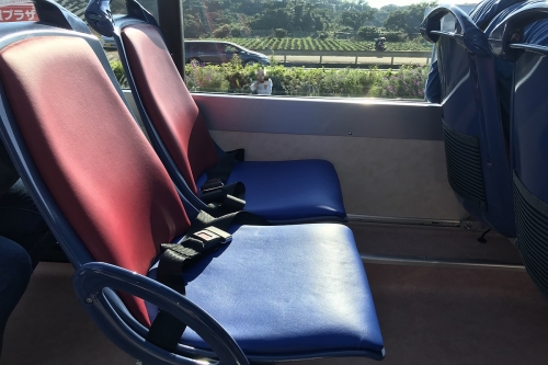 2階の座席は雨天時に濡れる事を考慮して、レザーの生地が使用されていますが、シートのフレームや壁、床部分などは2100形と同様、もしくは同系色のものが使用されています。なお、1番前には後方向きに設置された京急電鉄の職員用の座席があり、バスに乗車している間、道中をガイドしてくれます。