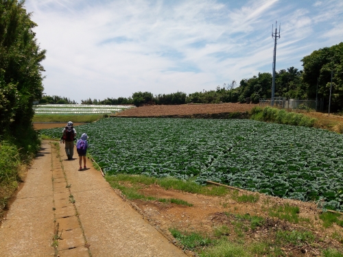 「毘沙門天入口」バス停は畑の真ん中にあり、本当に海岸沿いに出られるのか不安になりますが、バスの進む方向に歩いて分岐を左手に進んでいくと、10分足らずで漁港が見えてきます。そのまま漁港沿いに歩くと、「関東ふれあいの道」の道標がぽつんと立っています。
