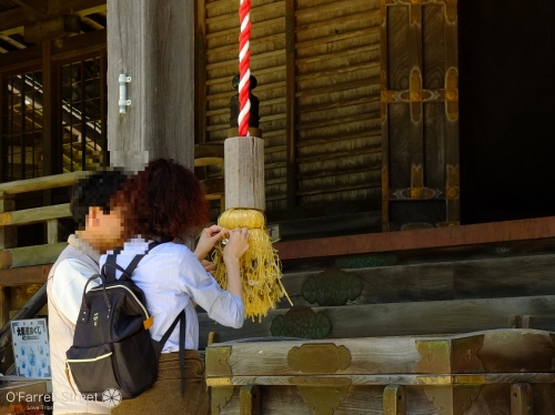 拝殿前の鈴の房には、5円玉や50円玉が結びつけられていますが、これは、「ご縁がありますように」と、願いながら結ぶ金華山ならではの珍しい風習です。拝礼をすませたら、ご縁を願って結んでみましょう。
