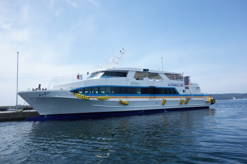 中型船(70人乗り)で土曜、日曜、祝日運行。10:30に鮎川港発、帰路は、12:30に金華山を出発します。所要時間は、約20分(往復1人2,500円)。定期便でも電話予約が必要なので、お忘れなく。その他、平日の運行、団体でのチャーター、モーターボートの運行などもありますので、金華山観光クルーズ公式サイトをご覧ください。