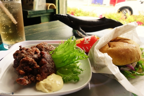 ご当地バーガーは、米粉に藻を練りこんで焼かれたほんのり緑色のパンで、パテはクジラの竜田揚げか、石巻のブランドサバである金華(きんか)サバフライから選べます。もっちりパンにジューシーなクジラの竜田揚げが美味しく、サイドメニューにもう一品追加してしまう美味しさでした。