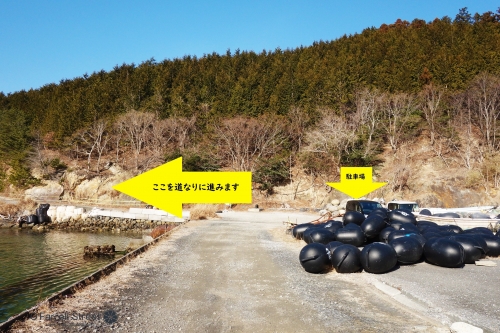 駐車場の住所か、宮城県漁業協同組合石巻地区支所荻野浜出張所(宮城県石巻市荻浜横浜山44)を目指して、海岸沿いに進むと突き当りが駐車場になっています。途中、漁業者の方、工事の方が作業をしているので、配慮が必要ですし、夜間の入場などは禁止されています。作品展示は2027年までの予定となっています。