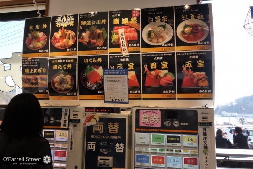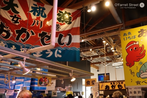 国道側から上っていくと、右手に干物がならんだ店舗があり、いっきに活気ある港町の風情で包まれます。旬の魚介類が味わえる店舗がならび、購入後は、店内やテラス席で頂けるようになっています。
