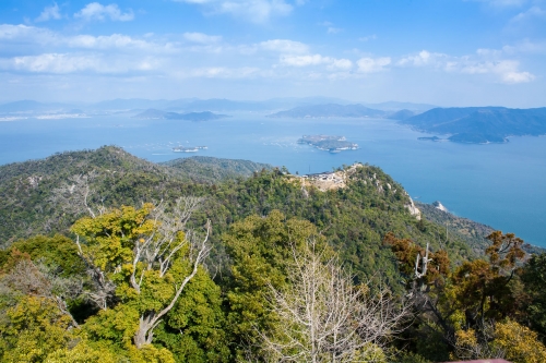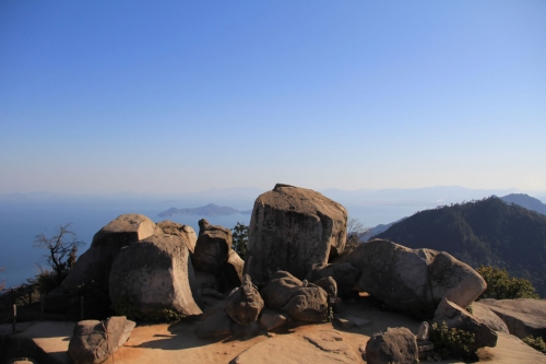 最近では恋に効くパワースポットとして女性にも人気の霊峰「弥山」。整備された登山道があり体力に自信のある方やハイキング目的の方は、麓から山頂まで徒歩でのぼることができます(往復約5時間)。手軽に楽しみたい方は、約15分のロープウェイで景色を楽しみながら登り、自然感じる山道を歩いて降りるのがおすすめ。山頂から見渡す、瀬戸内海と大小様々な島々の風景はまさに絶景!山頂付近では、弘法大師が100日間修行したとされる「弥山本堂」や、巨岩のトンネル「くぐり岩」などの観光スポットが点在しています。