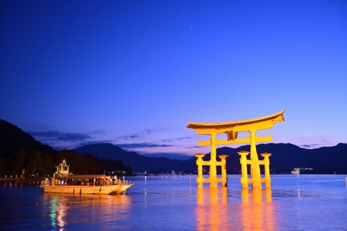 宮島を訪れたらぜひ、厳島神社のナイトクルーズを楽しみませんか?厳かな雰囲気の厳島神社は、日中でも十分に楽しむことが出来ますが、さらに幻想的な雰囲気に包まれるのが夜間のライトアップ。海上から見る大鳥居は日中のそれとは一味違い、条件がよければ、船に乗りながら鳥居をくぐることもできます。30分ほどのクルーズではガイドが同船し、厳島神社の成り立ちから鳥居の構造まで詳しく解説してもらえます。