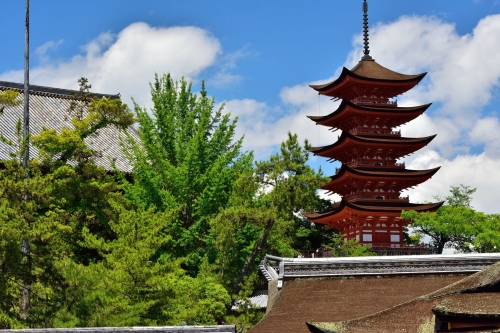 宮島では最大の木造建築で、建物内からは海や厳島神社を見渡す絶景が楽しめます。隣に建つ五重塔とともに重要文化財に指定されています。