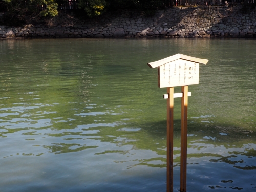 東回廊の1つ目の角を右折する少し手前で、左手を見てみてください。嚴島八景のひとつ、鏡の池を見ることができます。手鏡のように見えることから、このように呼ばれています。