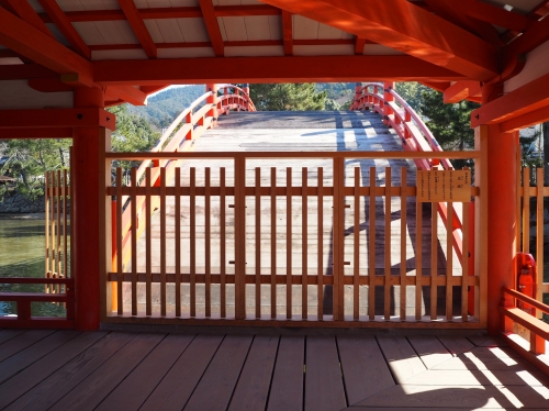 反橋は、天皇によって派遣された勅使が厳島神社を参拝する際に使用されていたようです。そのため、勅使橋とも呼ばれていました。正面から見るといかに急斜面なのかが伺えますが、それもそのはず、なんと高さは213.7m!勾配もすごそうです!