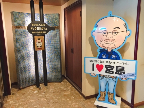 錦水館宿主のトニー武内さんのイラストパネルが、ブックカフェの目印です。本を読めるだけでなく、コーヒーや紅茶等のドリンクが無料でいただけます。