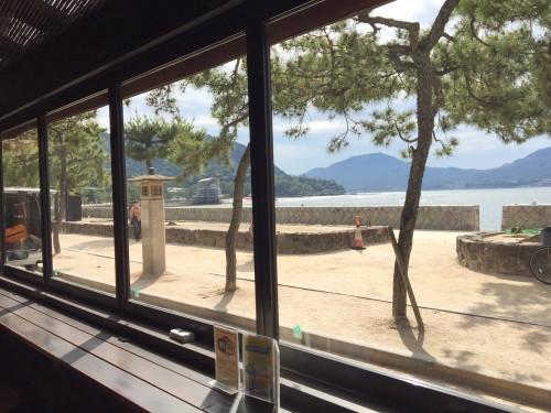 これから厳島散策をする人や散策を終えて帰りのフェリーに向かう人、自転車をこぐ地元の人の姿や歩く鹿等、宮島ならではの光景も見ることができます。風が心地よく、時間の許す限りこちらでぼーっと過ごしたい程、居心地が良いですよ。