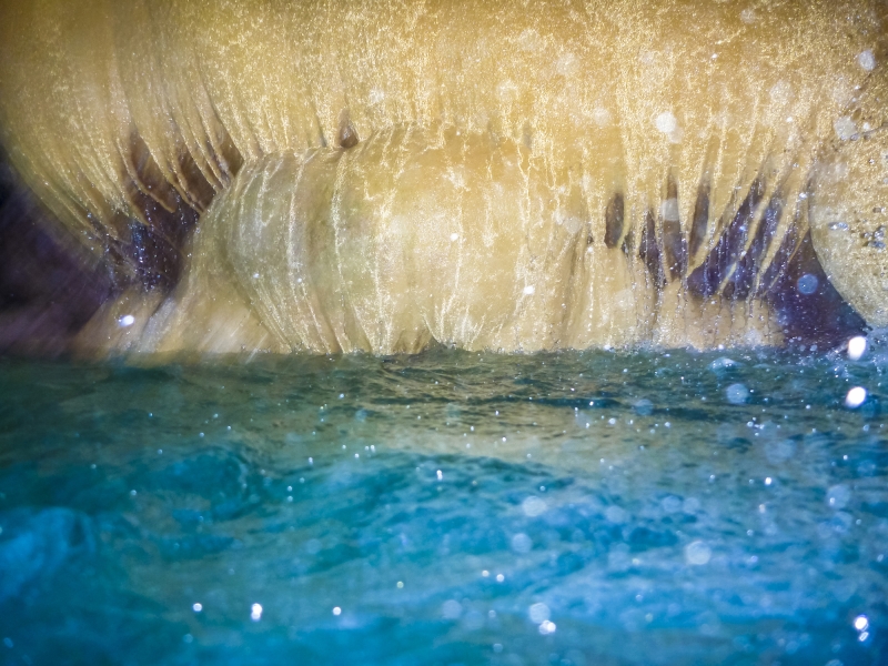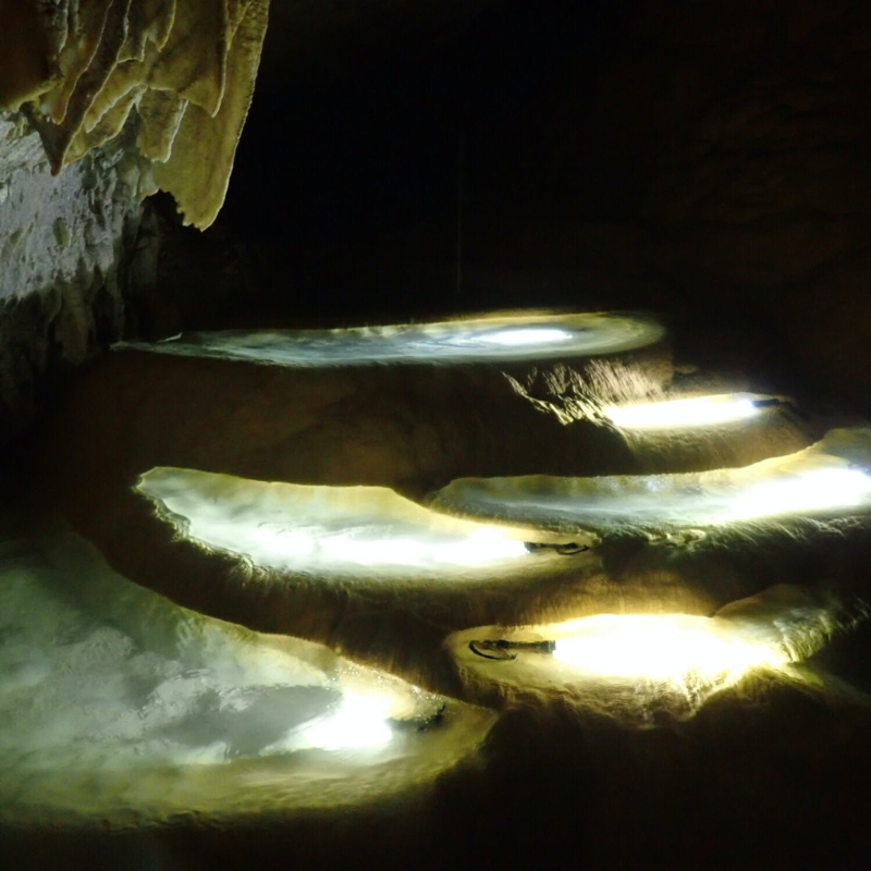 またこのかぼちゃ型鍾乳石の奥には、さらに鍾乳洞が続いています。「リムストーンプール」と呼ばれる、棚田のような段々状のトラバーチン(石灰質の岩)や氷柱状、カーテン状の鍾乳石などが視界いっぱいに広がり、その光景は息を呑む美しさ。竜宮の神が祀られているとも言われる、大迫力の空間です。