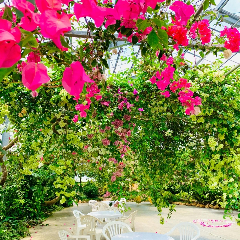 宮古島にある観光農園「ユートピアファーム宮古島」。マンゴーの成長を見ることができる「マンゴー園」、バナナやパッションフルーツ、パパイヤ、ドラゴンフルーツなどトロピカルなフルーツが実る「フルーツ園」、そしてブーゲンビレア(ブーゲンビリア)やハイビスカスなどが咲く「フラワー園」があります。とくにフラワー園では一年中ブーゲンビレアが咲き誇り、まさに楽園!