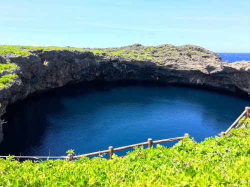 大小2つの円形の池には遊歩道が整備されており、お散歩しながら観光するのに最適です。2つの池は下で繋がっていて、さらに海とは地下洞窟で結ばれているそうで、巨大魚も生息しています。地下洞窟で探検気分を味わえる通り池はダイバーにとっては憧れのスポットとなっています。