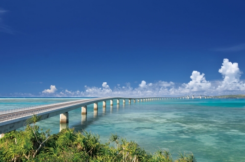 1995年に開通した、宮古島と来間島を一直線にむすぶ1,690mの橋。エメラルドグリーンの海を車で走るのはまさに気分爽快で、絶景ドライブコースとしても人気です。
