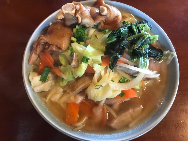 下の写真は野菜そば(700円)にてびちをトッピング(+300円)したもの。