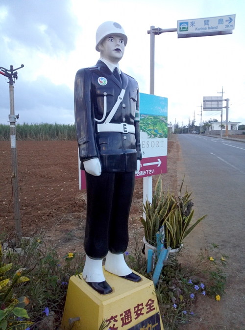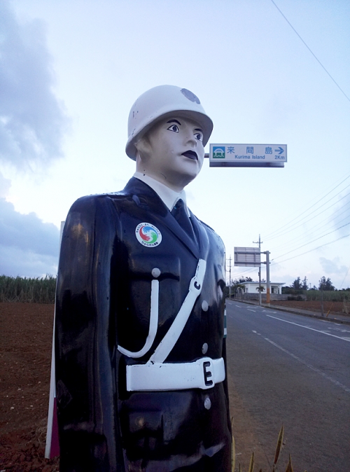 来間大島へ続く道路の交差点には「てつや」が立っています。ちょっと不気味な表情で、最初に見かけたときは正直ぎょっとするかもしれませんが、何度か見かけるうちに徐々に親しみが湧いてくる表情です。