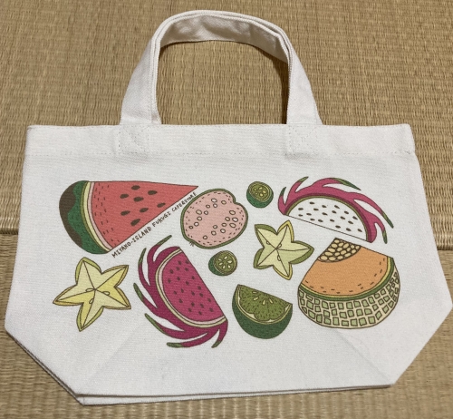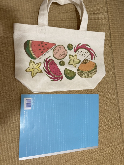 宮古島で採れる島野菜や島フルーツの絵がキャッチーなトートバッグは、島内にある「福木カフェ商店」の商品で、写真のSサイズは、大きさがW300xH200xD100mm、容量4Lと、ちょっと近所に買い物などへ行く時に使いやすいサイズ感です。二枚目の写真ではA4サイズのノートと比較してみました。
