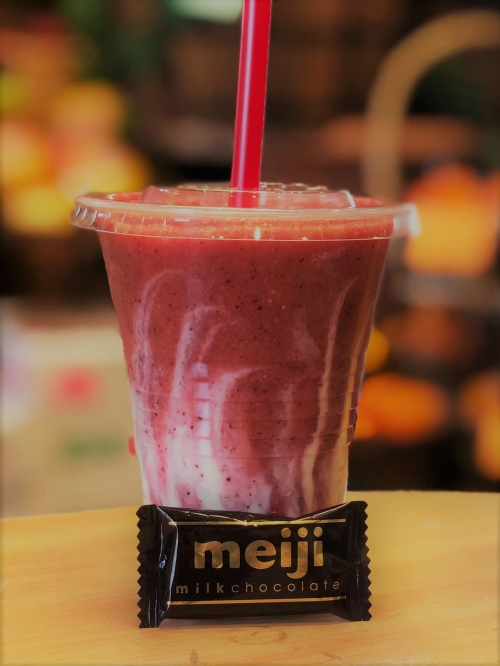 3分程で出来上がる新鮮フルーツジュースと一緒に手渡されるのは、小さなお菓子。子供でも大人でも、フルーツジュースと一緒におまけのお菓子を毎回プレゼントしてくれます。クッキーの時もあれば、この日はmeijiのチョコレート。このちょっとしたサプライズ&心配りが嬉しいですね。