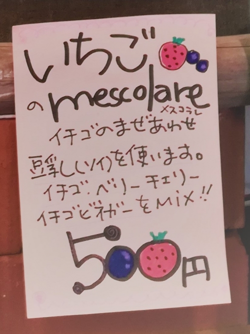 いちごmescolare(メスコラレ:500円)は、いちごのまぜあわせという意味。いちご、ベリーチェリー、イチゴビネガーをMIXしたドリンクです!豆乳を使っているので、酸味の中にまろやかさもあり、美味しくさっぱりいただけます。