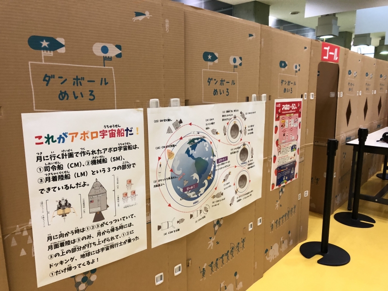 2Fでもサイエンスラボ前のギャラリーを使って、ワークショップを出していることがあります。この日は「月面迷路」と言うダンボールを使った子供用の迷路が、どどーん!と広がっていました。
