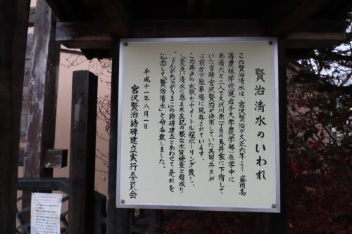 賢治が使った共同井戸も現存しており、それにちなんで「賢治清水」と名付けられたそうです。空のペットボトルを持参すれば水が汲めます。住民の方がランニングの途中で水を汲んでいる様子が印象的でした。