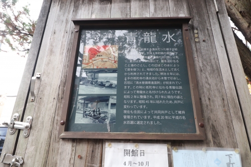 「平成の名水百選」に選ばれている湧水地です。江戸時代には自噴する湧水だったそうですが、現在は井戸になっています。共同井戸として、地域住民によって維持管理されています。