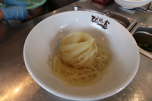その後、ザルに上げて冷水で冷やします。濁っていた冷麺が鮮やかに透き通る瞬間です。見どころですので、ぜひ注目してみて下さい。