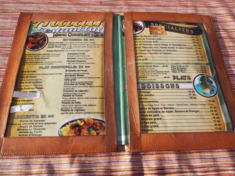 Chicken skewersは、タイ米の上にスパイスが効いた鳥肉や野菜、ポテトがのったプレートになったものです。味はクセはなく、万人受けなイメージです。タジンはDH50(約580円)、サラダなどの前菜類はDH25(約290円)、デザート類はDH20(約230円)ほどの価格帯でした。