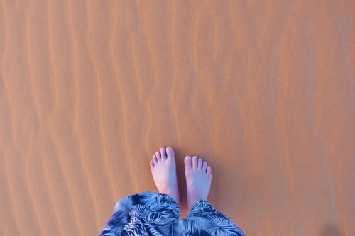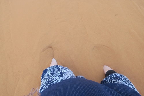 砂漠の砂は驚くほど細かくさらさらで、ずっと触っていても飽きない初めての感触です。斜面では、指や足をすーっと通すと滑らかに砂が流れていき、その光景を見ているだけで楽しいです。砂遊びに夢中になってしまいます。