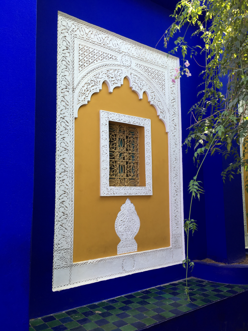 鳥の囀りが響き木漏れ日さす穏やかな庭内は、鮮やかな青と緻密な白の彫刻が差し色と相俟って、とても上品。サンローラン氏の記念碑もあり、この地を心の故郷とした彼の遺灰は庭園に撒かれました。見事に育ったサボテンが庭園に彩を添えています。