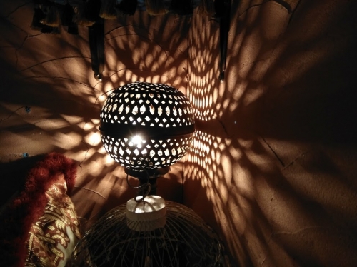 真鍮細工から洩れる光がエキゾチックなモロッコランプ、タジン鍋の型をした小物入れ、ラクダの置物、などが路地の両脇のお店にところ狭しと並んでいます。