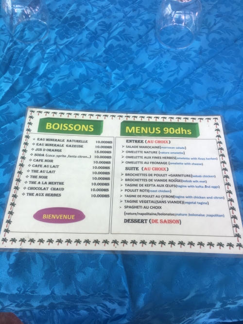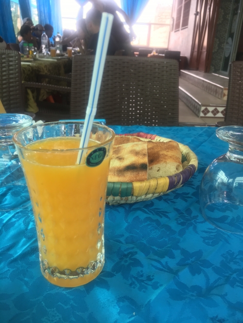 トドラ渓谷を後にして最初の休憩は、ランチ休憩です。砂漠に近づいているためか、温度が上がってきたように感じると思います。またSabaku toursで手配されていたこちらのレストラン、屋根があるテラス席のようなところで、エアコンはありません。暑さに体力を消耗しつつ、またタジン鍋とクスクスの洗礼を受けます。
