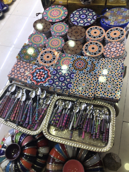 モロッコらしい幾何学模様の食器類も豊富です。お皿は大きくて持ち帰れない方は、写真右下のコースターがおすすめです。
