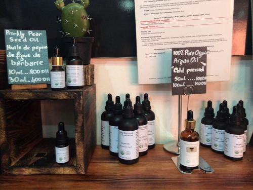 「モロッコの黄金」とも呼ばれ、美容にはかかせないアルガンオイル。写真下左は旧市街にあるコスメ屋さんで、ボトルに高級感がありますが、それでも50ml100DH(約1,200円)100ml150DH(約1,800円)と、日本より低価格。