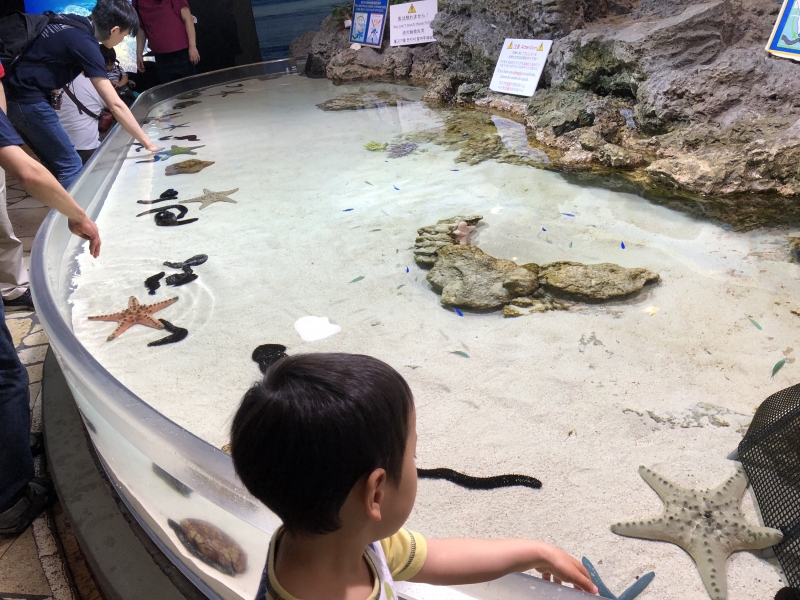 入口ゲートを入ると、目の前にはヒトデやナマコに触れられるコーナーがあり、子供たちもキャーキャー楽しそうに戯れています。ちなみに 「イノー」とは沖縄の方言で 「サンゴ礁に囲まれた浅い海」のこと。