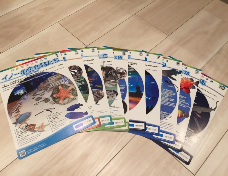 イノーの生き物たちと触れ合った後、奥に進むとすぐに、こんなカードのラックが目に入ると思います。カードには番号が振ってあり、水族館全体にNO.10まで置かれています。