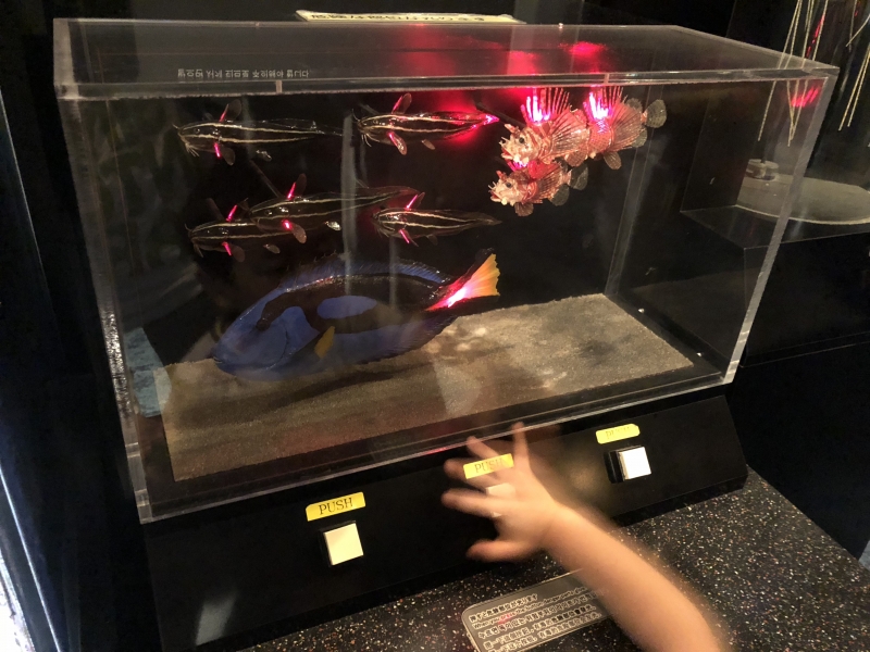 ボタンを押すと赤く光るところが毒、また触るとどのように刺されるのか?などといった模型と、そのすぐ隣に実物も展示されていて、とてもわかりやすいです。見逃しがちな狭いコーナーなのですが、ぜひ見てみてくださいね。
