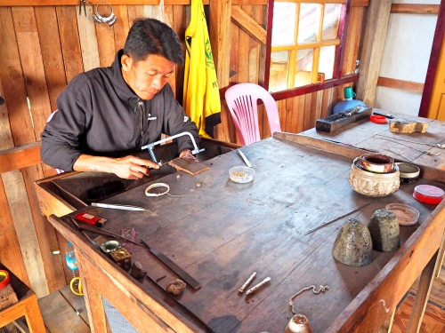 細かい作業をして銀を細工していく様子がみられます。尻尾が本物のように動く魚のチャームがここでは有名です。また、銀で作られたピアスやネックレスなどのアクセサリーもあります。