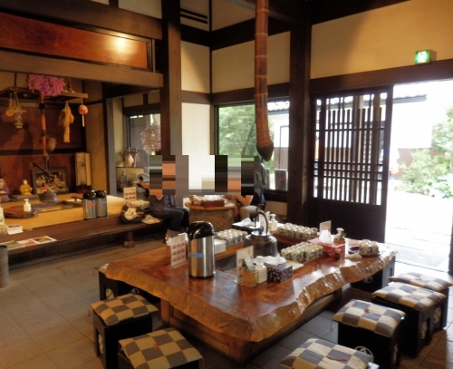 鬼無里の本店では、囲炉裏端や小上がりで、お茶と焼きたてのおやき、季節のお漬物が頂けます。おもてなしの心遣いが嬉しいですね。