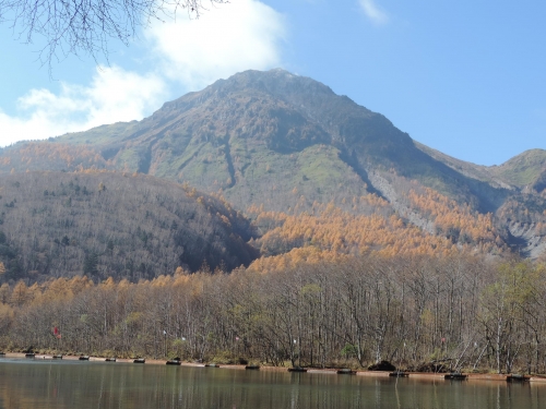 大正池の正面に見える、長野県と岐阜県にまたがる標高2,455mの北アルプス唯一の活火山。大正池とのコントラストがとても美しい山です。