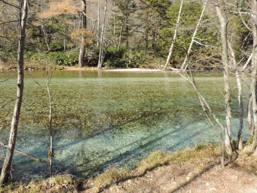 大正4年の焼岳の噴火により「梓川」が堰き止められたことによりできた池です。立ち枯れした木々が美しさを演出しています。