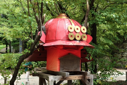 上田城東虎口櫓門の奥にある眞田神社。ここには、上田城を築城した真田昌幸、幸村、江戸時代の藩主である仙石家、松平家が祀られています。手前には真田軍の象徴として名高い赤備えの大兜が鎮座しています。正面には真田家の家紋、六文銭も。神社の左手奥に進むと真田井戸があり、これは、抜け穴になっていて、城の北の砦に通じていたそうです。