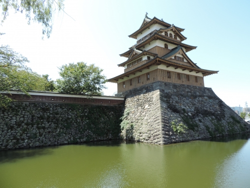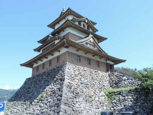 諏訪の桜の名所です。明治4年の廃藩置県により、城郭と天守閣が一度は取り壊されましたが、1970年に天守閣と冠木門(かぶきもん)、角櫓(すみやぐら)が復元され、昔の様子を伺う事ができます。天守閣には300円で入場でき、最上階からは諏訪湖を一望できます。