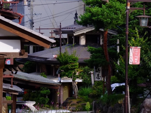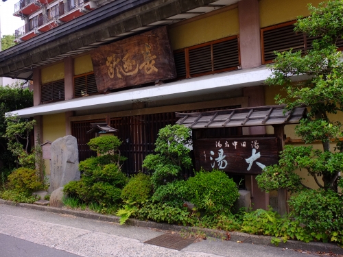 旅館よろづやの本館脇にあるのが、湯田中温泉開湯からの共同浴場ですが、浴場というよりは、まるで旅館のように、屋根にはシャチホコが鎮座し、風格ある建物にびっくりします。入浴希望の場合は、よろづやのフロントで鍵を借りるようになります。